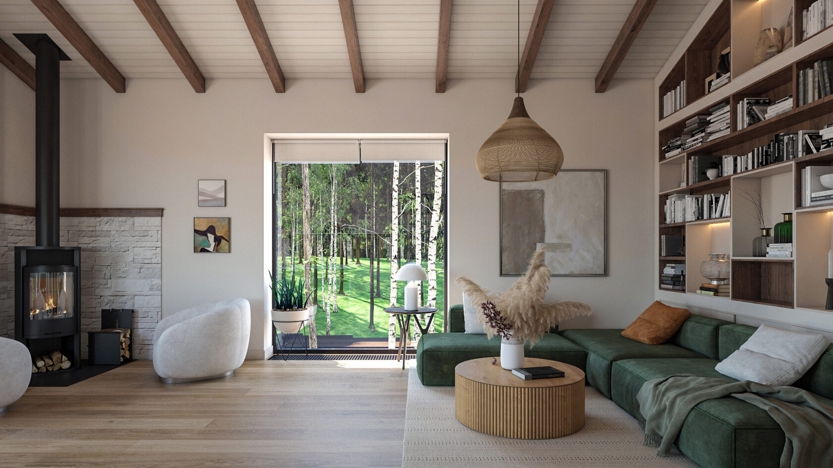 Интерьер одноэтажного загородного дома 100 кв.м. с использованием натуральных природных материалов.